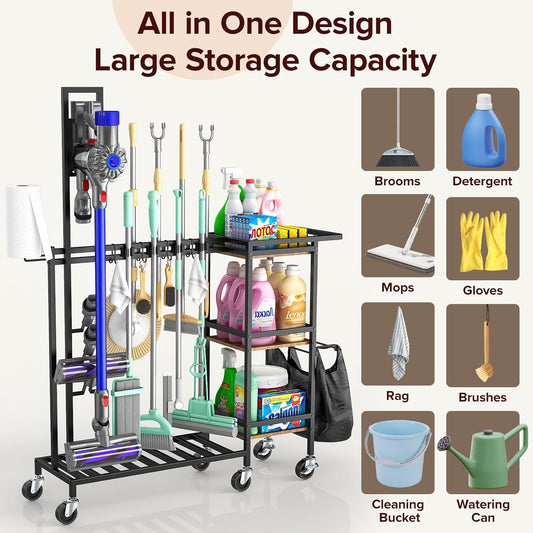 Cleaning Utility Cart on Wheels, Multifunctional Cleaning Tools Supplies Organizer with Broom and Mop Holder, Vacuum Stand Compatible with Dyson, Rolling Storage Caddy Cart for Home
