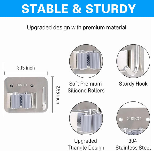 HANZE 2 Pack Stainless Steel Mop Broom Holder Organizer, Self Adhesive Wall Mounted Mop Organizer Storage Rack Clip for Kitchen Bathroom and Garage (Rectangle, Large)