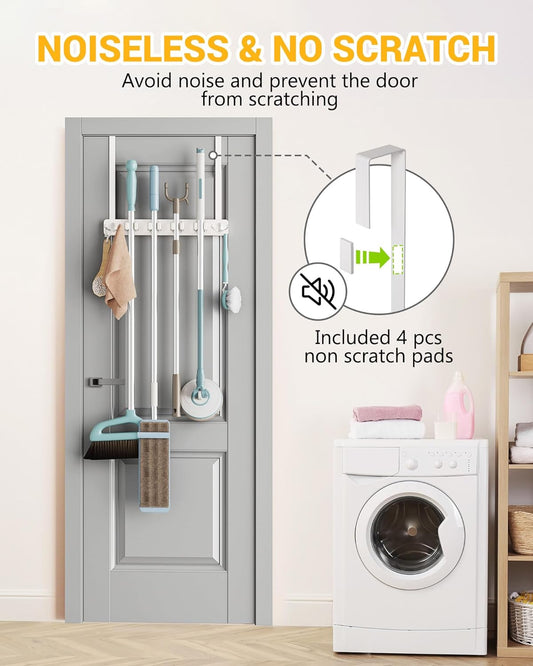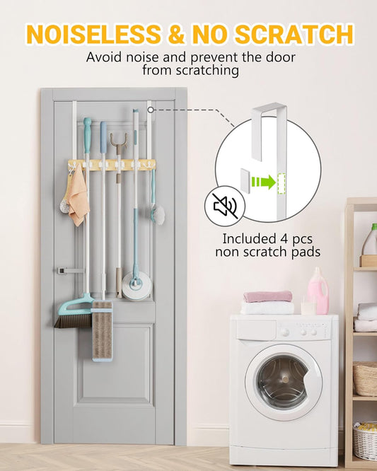 Lorbro Broom Holder Door Mount, Over the Door Broom and Mop Holder with 2 Over Door Hooks, Wood Broom Hanger, Tool Rack Organizer for Laundry, Garage, Closet, Kitchen Decor, 4 Slots & 4 Hooks Rustic