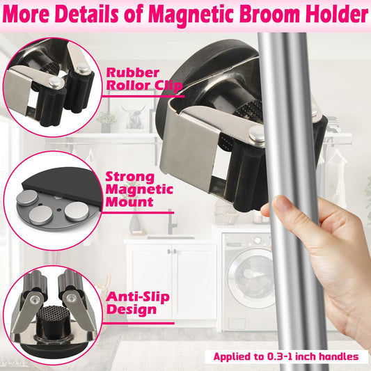4 Pack Magnetic Mop Broom Holder, Heavy Duty Magnetic Mop Hanger for Refrigerators, Magnetic Mount Mop Broom Holder for Laundry Room Garage Kitchen Workshops Metal Shed