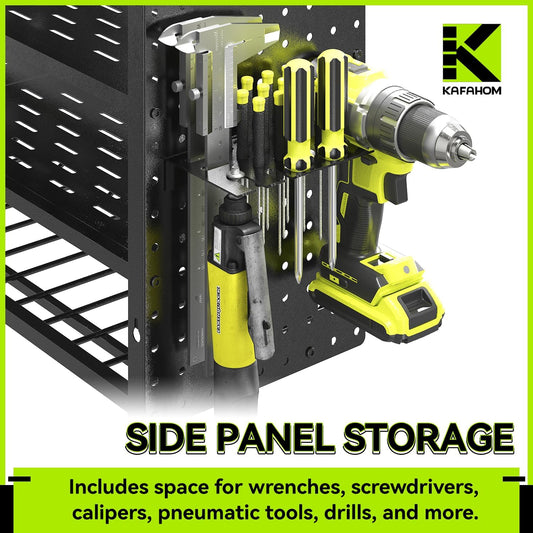 KAFAHOM Power Tool Organizer with Charging Station,9 Drill Holder Wall Mount,4 Layer Durable Metal Cordless Drill Storage for Garage Organization,Battery Tool Rack Built in 7 Outlet Power Strip Black
