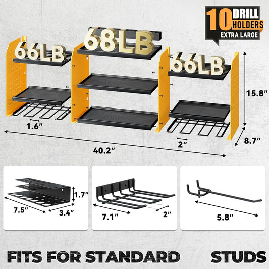 KAFAHOM Power Tool Organizer with Charging Station,9 Drill Holder Wall Mount,4 Layer Durable Metal Cordless Drill Storage for Garage Organization,Battery Tool Rack Built in 7 Outlet Power Strip-Yellow