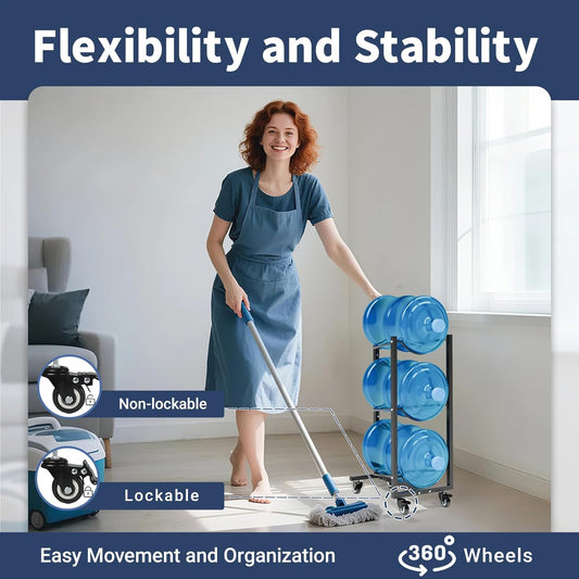 Water Jug Holder with 4 Wheels: 3 Tier Movable Gallon Bottle Storage Rack for Office Gym Garage - Black