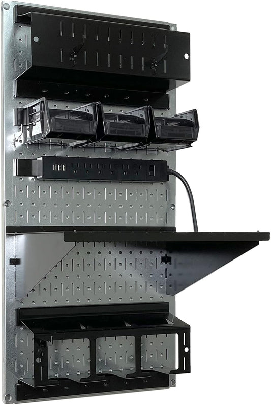 Wall Control Power Tool Storage Organizer Kit Cordless Drill Holder Charging Station Rack 16” x 32” Metal Pegboard Organization System (Metallic Pegboard)