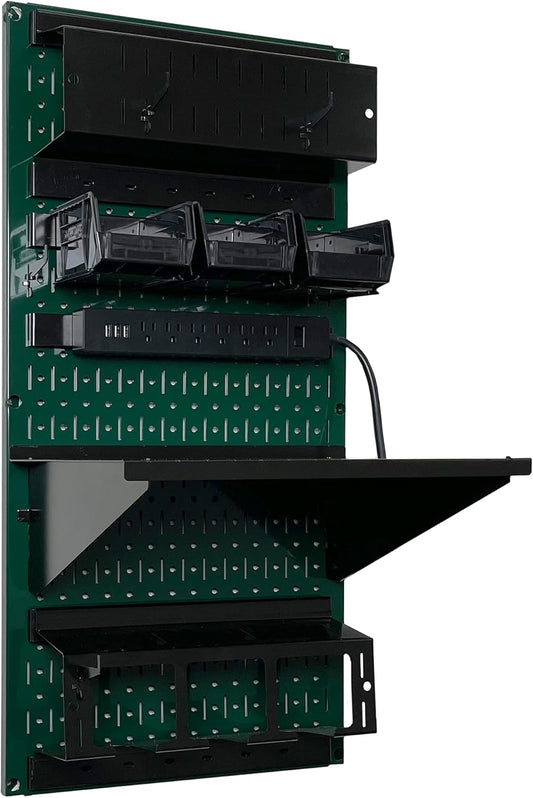 Wall Control Power Tool Storage Organizer Kit Cordless Drill Holder Charging Station Rack 16” x 32” Metal Pegboard Organization System (Green Pegboard)