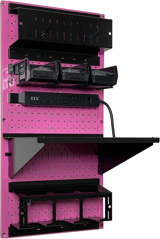 Wall Control Power Tool Storage Organizer Kit Cordless Drill Holder Charging Station Rack 16” x 32” Metal Pegboard Organization System (Pink Pegboard)