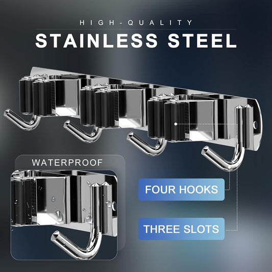 ZONGOOL Mop Broom Holder Wall Mount, Broom Organizer Mop and Broom Storage Tool Racks Stainless Steel Wall Hanger for Home Kitchen Garden Laundry Garage (3 Racks with 4 Hooks, Silver)