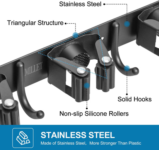 IMILLET Broom and Mop Holder Wall Mounted, Stainless Steel Broom Organizer Heavy Duty Tools Organizer Self Adhesive Mop Holder for Home Laundry Room Garage Garden (4 Racks and 5 Hooks)