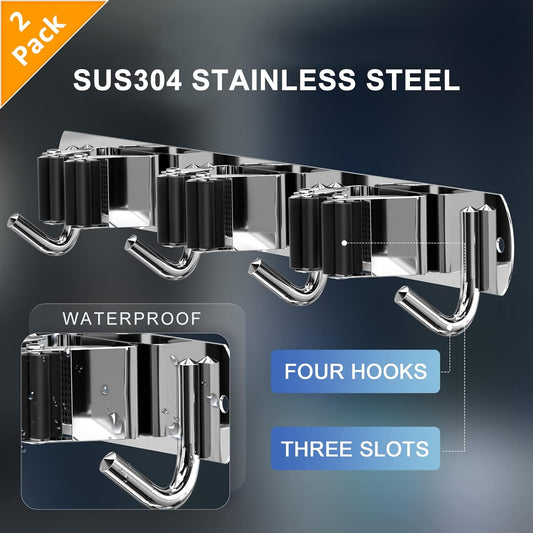 ZONGOOL 2 Pack Mop Broom Holder Wall Mount, 4 Racks and 5 Hooks Broom Organizer Storage Tool Racks Stainless Steel Non-slip Wall Hanger for Home Kitchen Garden Laundry Garage (Silver)