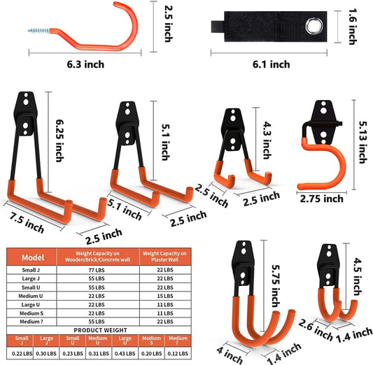 Heavy Duty Garage Hooks 6 Pack, J Shaped Hanger, Wall Mounted Storage System, Power and Garden Tool Organizer, for Hanging Ladders, Bikes Tires, Hose, Bulk Items
