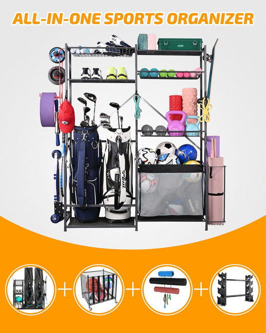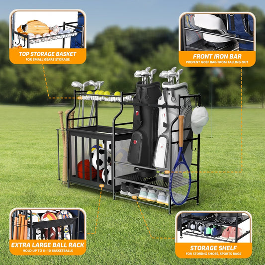 PLKOW Sports Equipment Organizer Rack, Garage Ball Rack, 2 Golf Bag Storage and Sports Gear Organizer for Garage