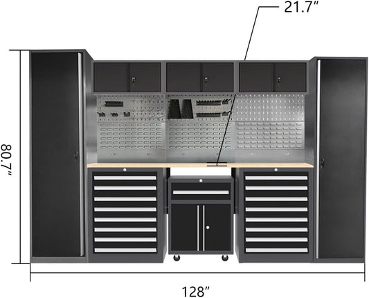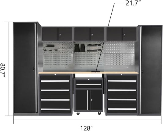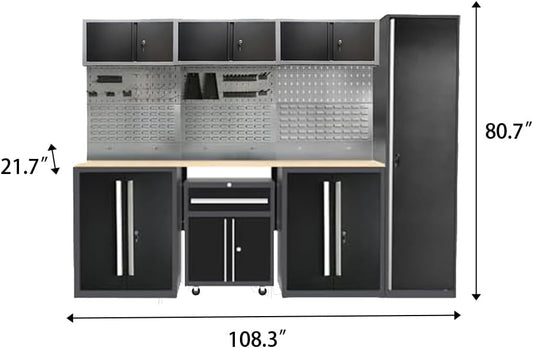 JZD Garage Storage Cabinet Set with Workbench System, Included Tool Cart, for Auto Repair Shop Basement Factory