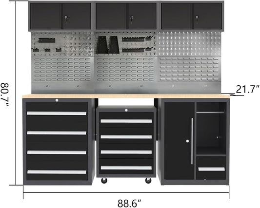 JZD Steel Garage Storage Cabinet System with Workbench, Included One Tool Cart, for Utility Room Workshop
