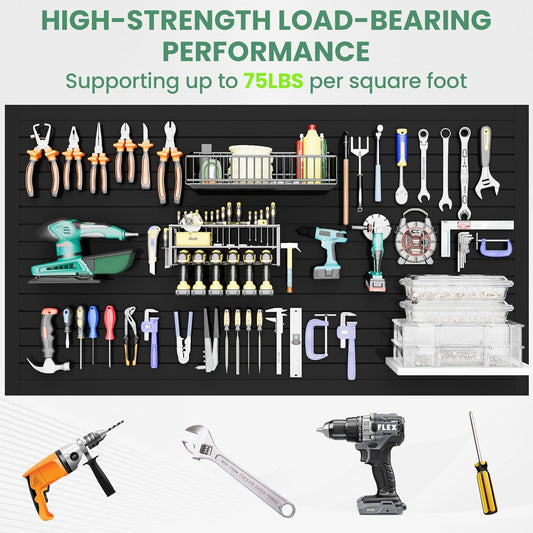 Slatwall Panel Wall Storage Systems, 4x8 ft Slat Wall Paneling Garage Wall Organizer with Five Hooks, Heavy Duty Wall Mounted PVC Wall Rack, Black