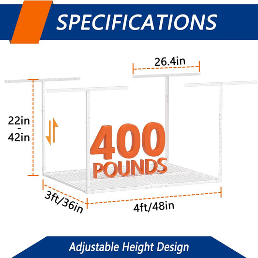3 x 4FT Overhead Garage Storage Rack,Adjustable Ceiling Storage Racks,Garage Shelving Heavy Duty Storage Organizer System,400lbs Weight Capacity(White)