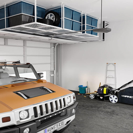 FLEXIMOUNTS 3x8 Overhead Garage Ceiling Storage Rack, Adjustable Garage Organization System, Heavy Duty Metal, 600lbs Weight Capacity, White