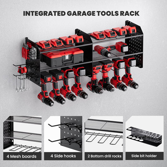 TRZZ 2-in-1 Power Tool Organizer Wall Mount, 3-Layer Drill Holder with 2 Side Pegboards, 8 Drill Holders, 4 Hooks, and 1 Drill Bit Rack, Tool Storage for Garage, Workshop, and Tool Room (Black)