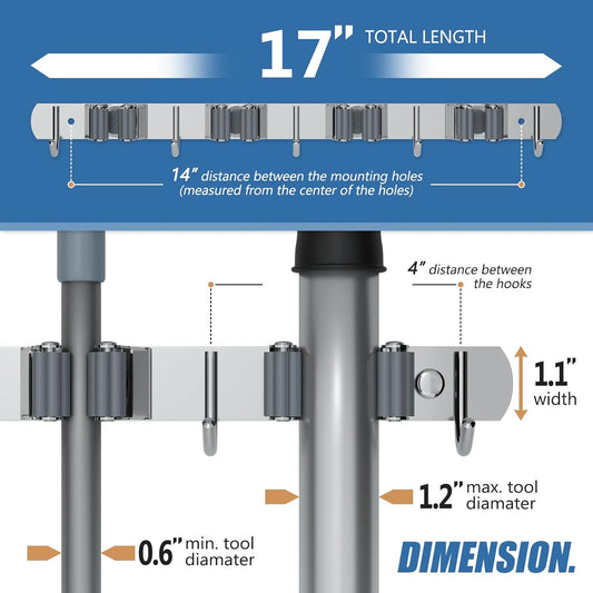 Wall Mounted Broom and Mop Organizer, Heavy Duty Stainless Steel Storage Rack for Brooms, Mops, Tools Space Saving Home Garage Organization (4 Racks with 5 Hooks)