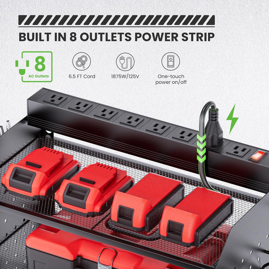 TRZZ Power Tool Organizer Wall Mount, 5-Layer Charging Station with 8 Outlets, 6 Drill Holders, 2 Side Pegboards, and Drill Bit Rack for Garage, Workbench, and Workshop (Black)