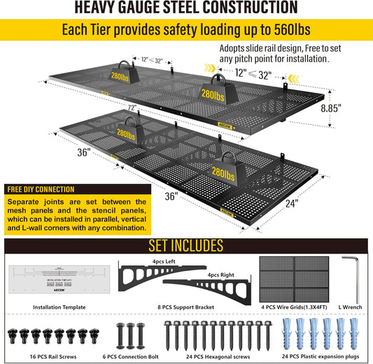 2-Pack 1.64x4ft Adjustable Garage Wall Shelving 560lbs Load Capacity Heavy Duty Wall Mounted Storage Shelf Metal Floating Shelves for Garage(Black)