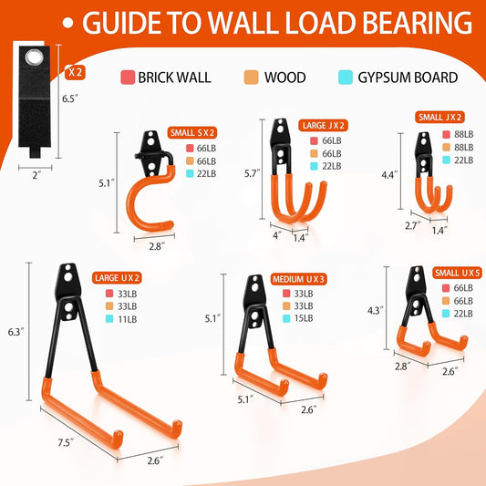 Nacial 16 Pack Garage Hooks Heavy Duty, Utility Steel Garage Storage Hook with 2 Extension Cord Storage Straps, Utility Garage Wall Mount Hooks for Hanging Bike, Ladder and Garden Tools, Orange