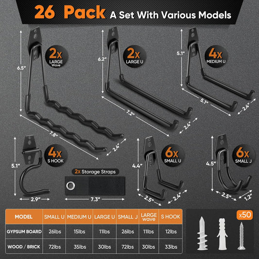 Nacial 26 Pack Garage Hooks Heavy Duty, Utility Steel Garage Storage Hooks with 2 Extension Cord Storage Straps, Utility Garage Wall Mount Hooks for Hanging Bike, Ladder and Garden Tools, Black