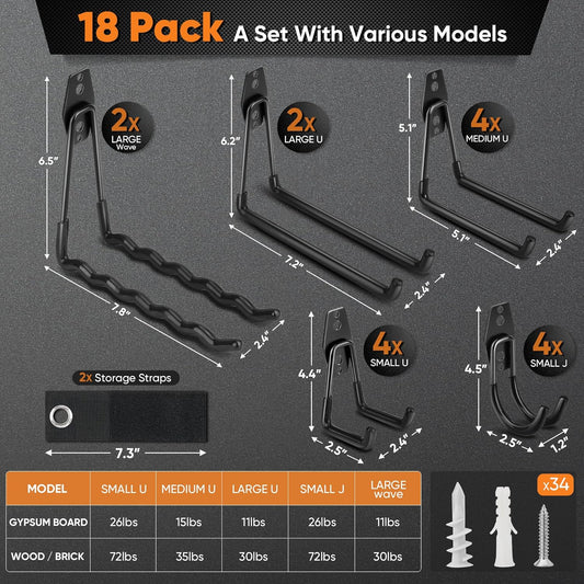 Nacial 18 Pack Garage Hooks Heavy Duty, Utility Steel Garage Storage Hook with 2 Storage Straps, Utility Garage Wall Mount Hooks for Hanging Bike, Ladder and Garden Tools, Perfect for Father Day Gifts