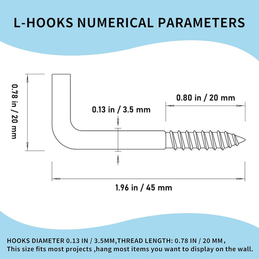 304 Stainless Steel 2-3/4 in Screw-in Hooks 20 Pcs,7 Shape Screw Hooks,Right Angle Medal Hooks l Shaped Screw in Hooks for Hanging