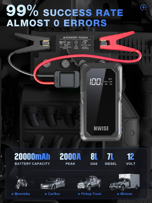 NWISE Car Jump Starter, 2000A Peak 20000mAh Portable Battery Starter with Smart Safety Jumper Clamps,12V Jump Boxes with Dual USB Quick Charge 3.0, LED Light