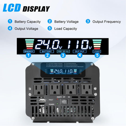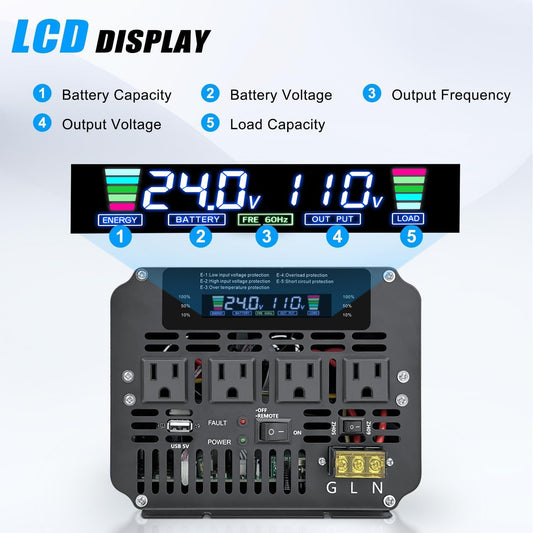 4000 Watt Power Inverter, Car Inverter 24V DC to 110V/120V AC Converter with LCD Display, 4 AC Outlets, USB Port & Remote Controller for RV, Truck, Off-Grid Solar System
