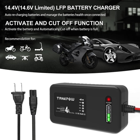 4-Amp LiFePO4 Battery Charger,14.6 Volt Lithium Battery Charger,Smart Charger for Cars,Motorcycles,Lawn Mowers,Toy Cars,Golf Carts,UAV,Fishing Boat,Lithium and Deep Cycle Batteries