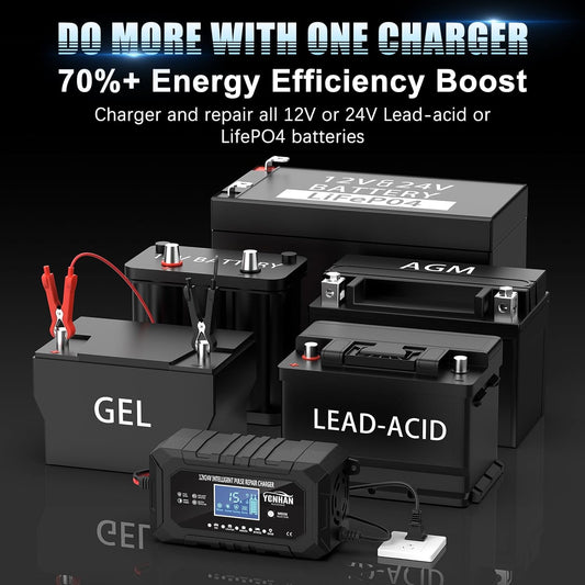 YONHAN 15-Amp Battery Charger LiFePO4 Trickle Car Battery Charger 12V 24V Fully-Automatic Smart Battery Chargers, Lead Acid Portable 9-Stage Smart Battery Maintainer with Temp Compensation(Black)