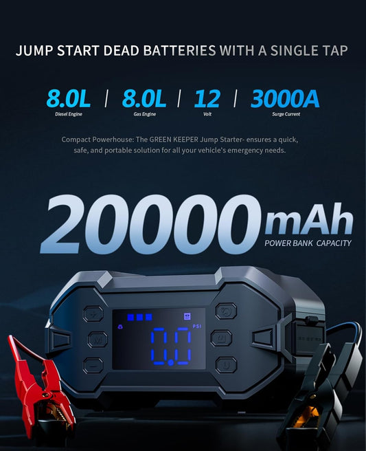 Portable Car Jump Starter 3000A with Air Compressor 12V Battery Jumper Emergency for 8.0L Gas & Diesel Engines Power Booster Start Boost Charger Box and Power Bank, for All Weather (GK-J1206P)