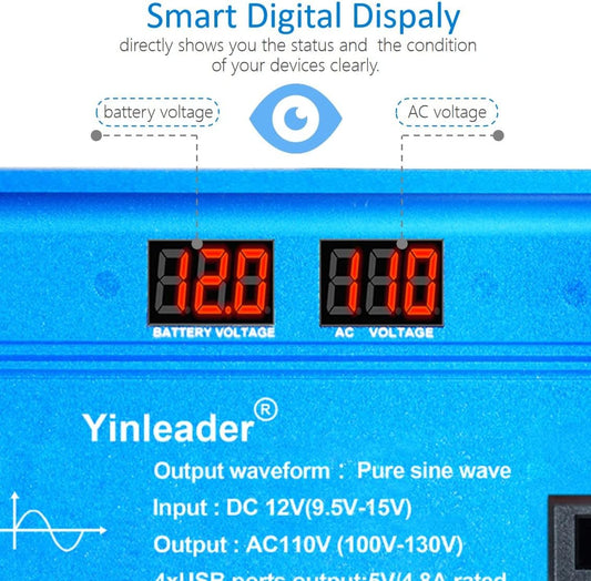 Yinleader 1000 Watt Pure Sine Wave Inverter 12V to 110V DC to AC Car Power Inverter for RV, Road Trip, Camping, Travel, 3 AC Outlets and 4 Built-in 5V/4.8A USB Ports, LCD Display, Blue