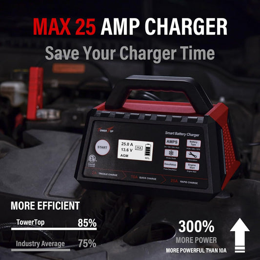 TowerTop 25A Max Pro Battery Charger: 12V Fully Automatic Smart Trickle Charger, Automotive Battery Maintainer with Engine Start, DC Supply, Winter Mode, Recondition,Desulfation, for Lead Acid/Lithium