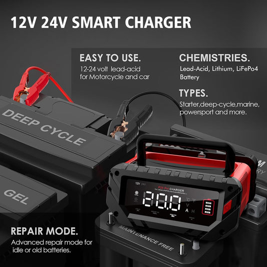 Battery Charger 0-20A 12V/24V Lithium LiFePO4 Lead Acid Fully Automatic Maintainer, Smart Car Battery Charger,Trickle Charger w/Pulse Repair for Trucks,Boats,Motorcycles,Deep Cycle Batteries
