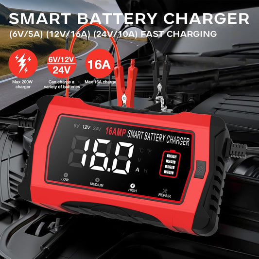 16-Amp Battery Charger, 6V/12V/24V Smart Car Battery Charger, Automotive Battery Maintainer, Trickle Charger for Car, SUV, Motorcycle, Boat, Lead-Acid, Lithium, LiFePo4 Battery