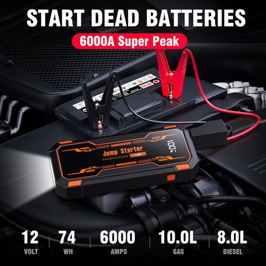 Car Battery Jump Starter with 6000A Peak Smart Clip LCD Display and 3 Modes Flashlight for Up to All Gas and 10.0L Diesel Engine 12V Auto Battery Booster Jumper Cables Portable Lithium Jump Box