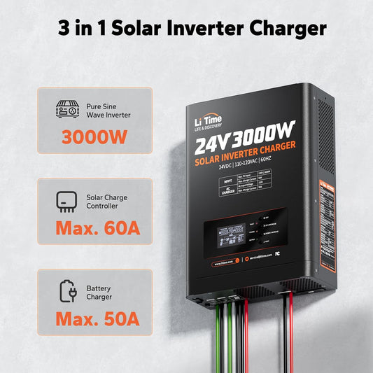 LiTime 24V 3000W All-in-One Solar Inverter Charger | 60A MPPT Solar Controller | Pure Sine Wave Output | Uninterrupted Power Supply | RS485 Communication | Home Energy Storage, Off-Grid Solar System