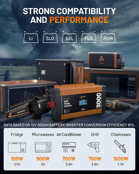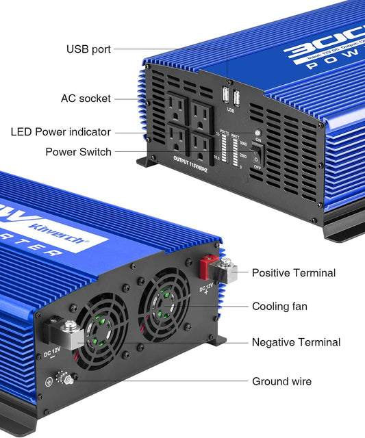 Ampeak 3000W Pure Sine Wave Inverter 12V DC to 120V AC for RV Truck 3AC Outlets Dual USB Ports Power Inverter