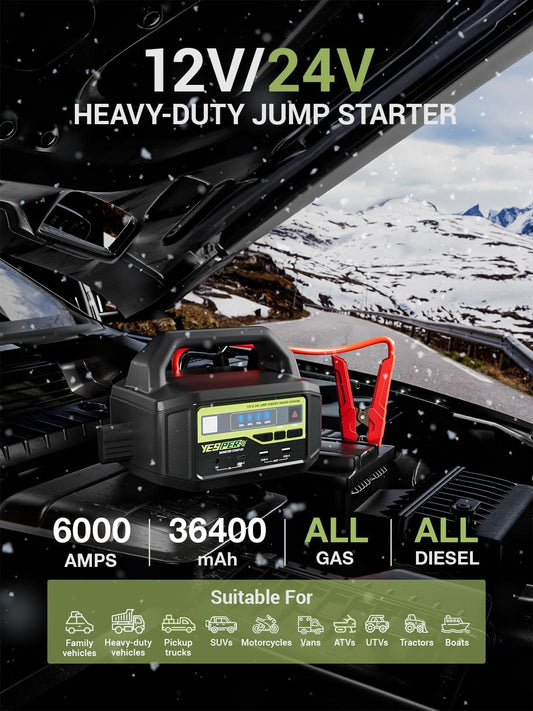 YESPER 12V/24V Car Jump Starter, 6000A Peak 5.1 lbs Portable Jump Starter Battery Pack Quick Charge with AC Adapter 36400mAh Battery Booster Pack (Up to All Gas/Diesel Engine) Jumper Box
