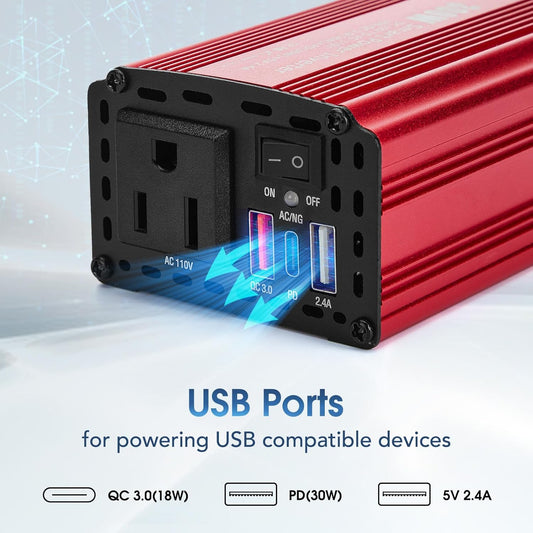 300W Car Power Inverter,12V DC to 110V AC Inverter Converter for Vehicles, PD (Type-C) QC3.0 and 2.4A USB Car Adapter with Cigarette Lighter Ports for Smartphones Laptops Tablets