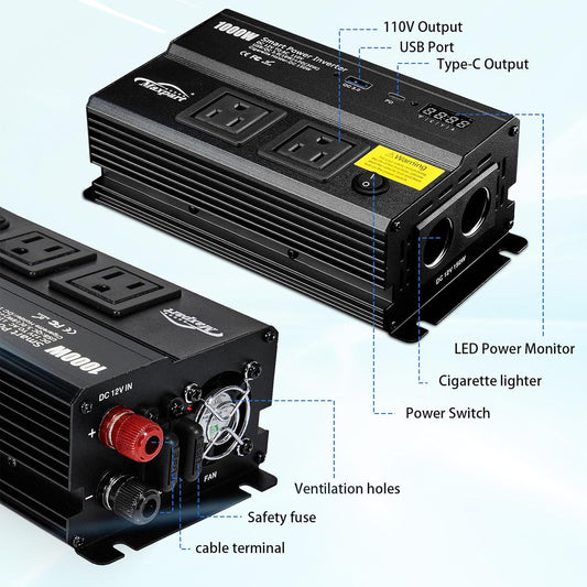 1000W Pure Sine Wave Inverter 12V DC to 120V AC Converter,1000 Watts 12 Volt Car Power Inverter for Home,Camping, RV, Truck, Vehicles, Emergency with Built-in a Type-C, Dual 5.2V/2.4A USB, 3AC Outlets