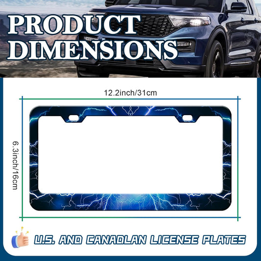 Blue Lightning License Plate Frames - 2 Pack Cool Thunder Stainless Steel License Plate Holder,Rust-Proof Waterproof Car Decorative Tag Frame with Screws Fasteners Caps