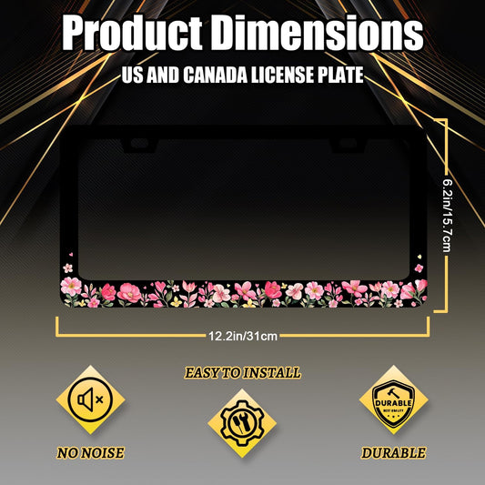 Pink Flowers License Plate Frame Colorful Floral Flower License Plate Stainless Steel Women Accessories Cars Decor 12.2 X 6.2 Inch with 2 Holes and Screws Fits Standard Us Ca Vehicles