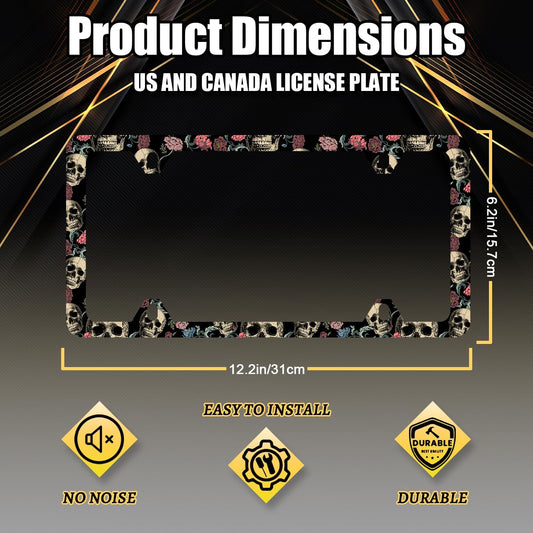 Skulls Flowers License Plate Frame Colorful Skull License Plate Stainless Steel Funny Accessories Cars Decor 12.2 X 6.2 Inch with 4 Holes and Screws Fits Standard Us Ca Vehicles