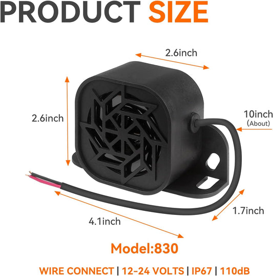 830 Back-up Alarm 12V-24V 110dB IP67 Waterproof Dust-Proof Reversing Warning Alarm with Super Loud Beeper Tone for Truck Van Forklift Car Lorry Agricultural Vehicles