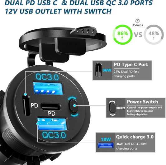 Dual PD USB C Ports & Dual USB Quick Charge 3.0 Ports 12V USB Outlet with Switch, VANONE Waterproof and Dustproof Car Charger Socket, Accessories for Car Boat Marine Motorcycle RV ATV Golf Cart, etc