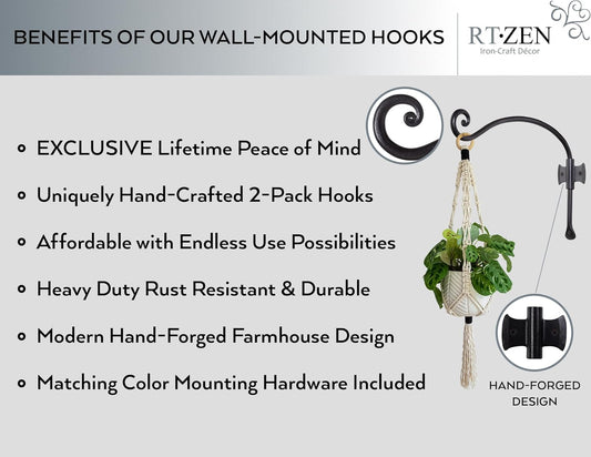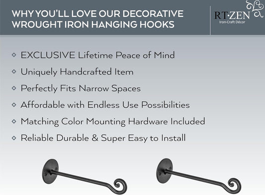 RTZEN Plant Hangers Outdoor or Indoor - Wrought Iron Metal Hanger Indoor Hook - Heavy Duty Wall Bracket Hooks for Hanging Plants Baskets Lanterns Wind Chimes - 2 Pack (Black Swirl Hooks)