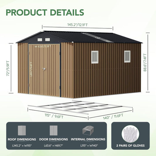 10X12X7.5 FT Outdoor Steel Storage Shed with Lockable Doors, 2 Windows, Transparent Roof Panels, Metal Frame Floor (Wood Panels Not Included), Ideal for Backyard, Patio Storage,Chicken Coop,Brown